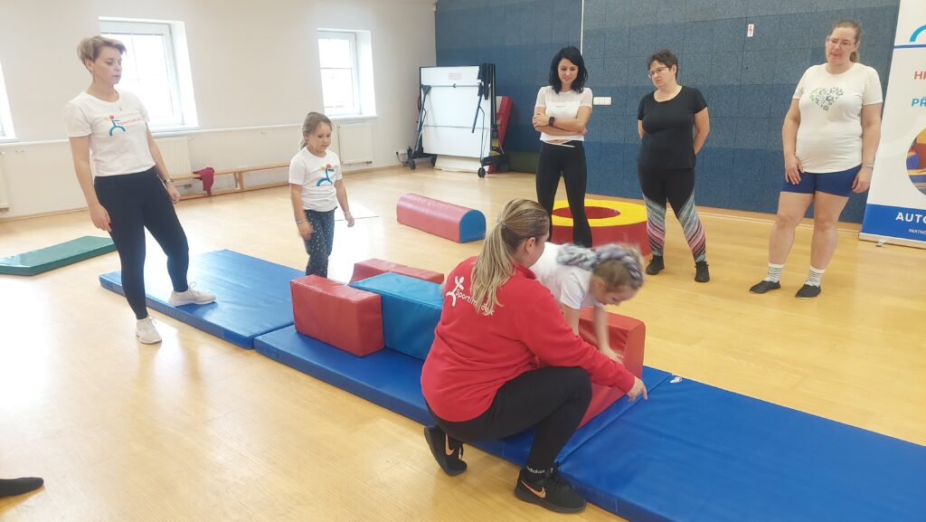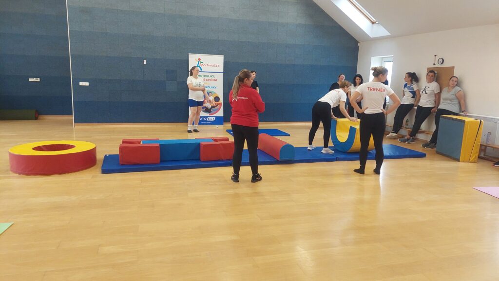 Po pauze na oběd přišla na řadu praktická část. V tělocvičně si paní učitelky vyzkoušely pohybové hry, nápady a aktivity, které děti nejen rozhýbou, ale zároveň je dobře zabaví. Nedílnou součástí cvičení byla gymnastická sada Sportimáčku, která nabízí mnoho možností využití při pohybových aktivitách s dětmi uvnitř i venku. S ukázkami cvičení na gymnastické sadě nám pomohly dvě šikovné pomocnice předškolního věku, díky kterým mohly paní učitelky přesně vidět, jak lze s gymnastickou sadou pracovat přímo s dětmi.