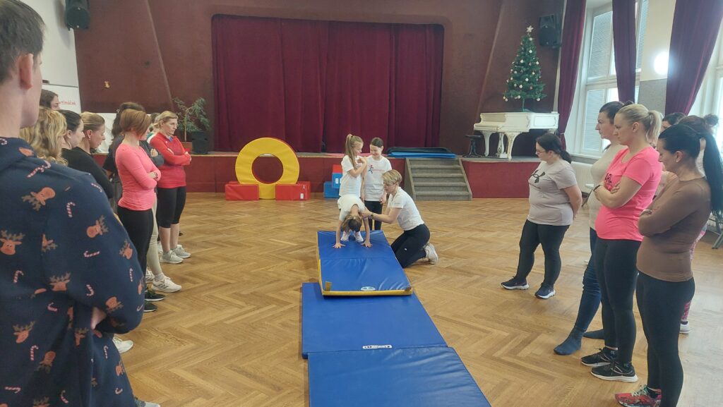 Při praktických ukázkách jim navíc pomohly i malé šikovné slečny, díky kterým mohly trenérky názorně ukázat, jak správně, zábavnou a přirozenou formou děti do pohybu zapojit.