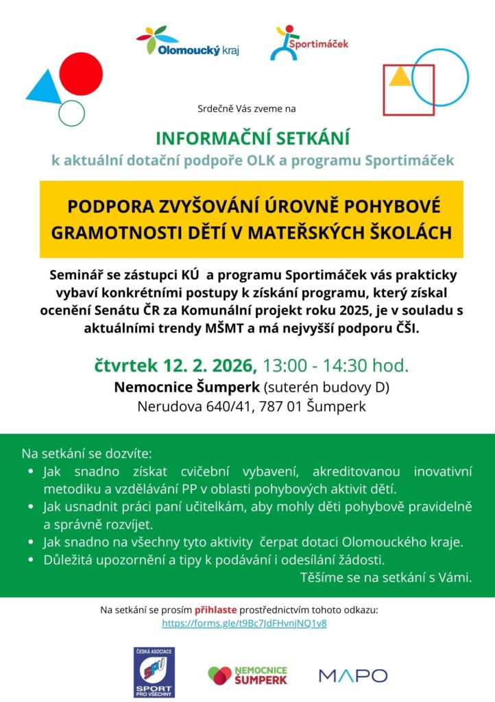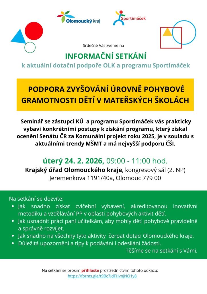 Ve spolupráci se zástupci KÚOK a programu Sportimáček se uskuteční dvě praktická informační setkání, kde se vedení MŠ dozví: